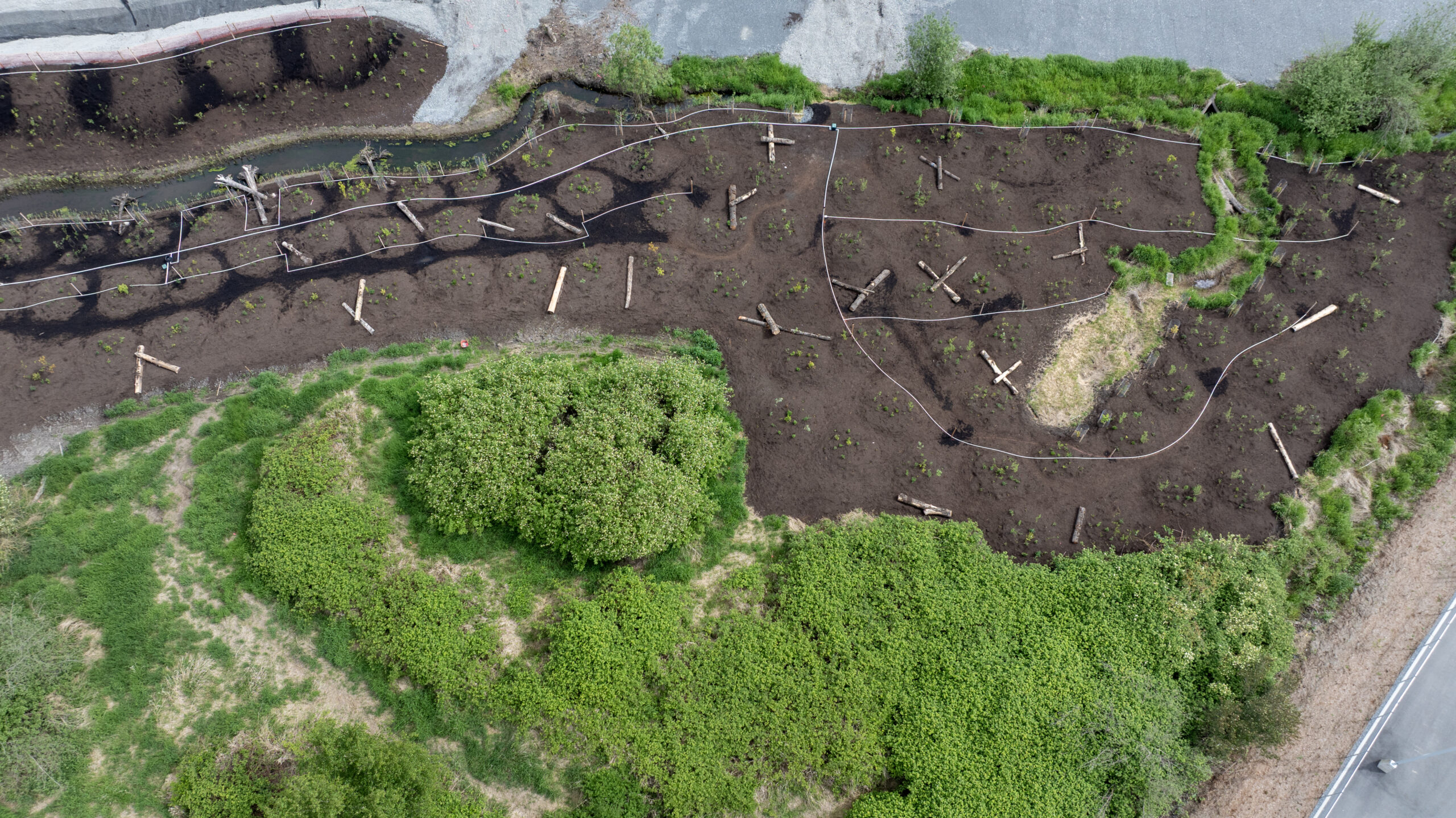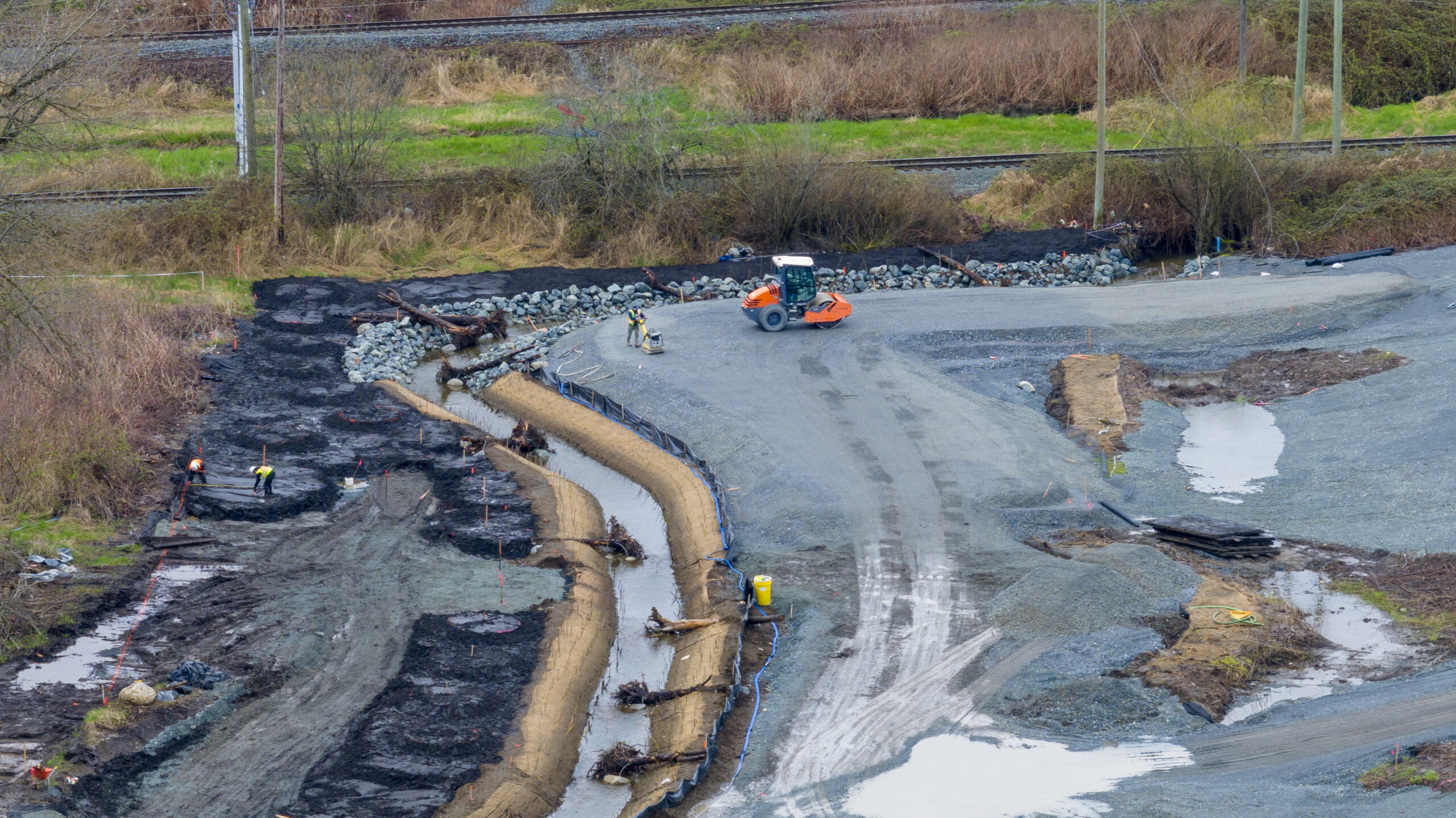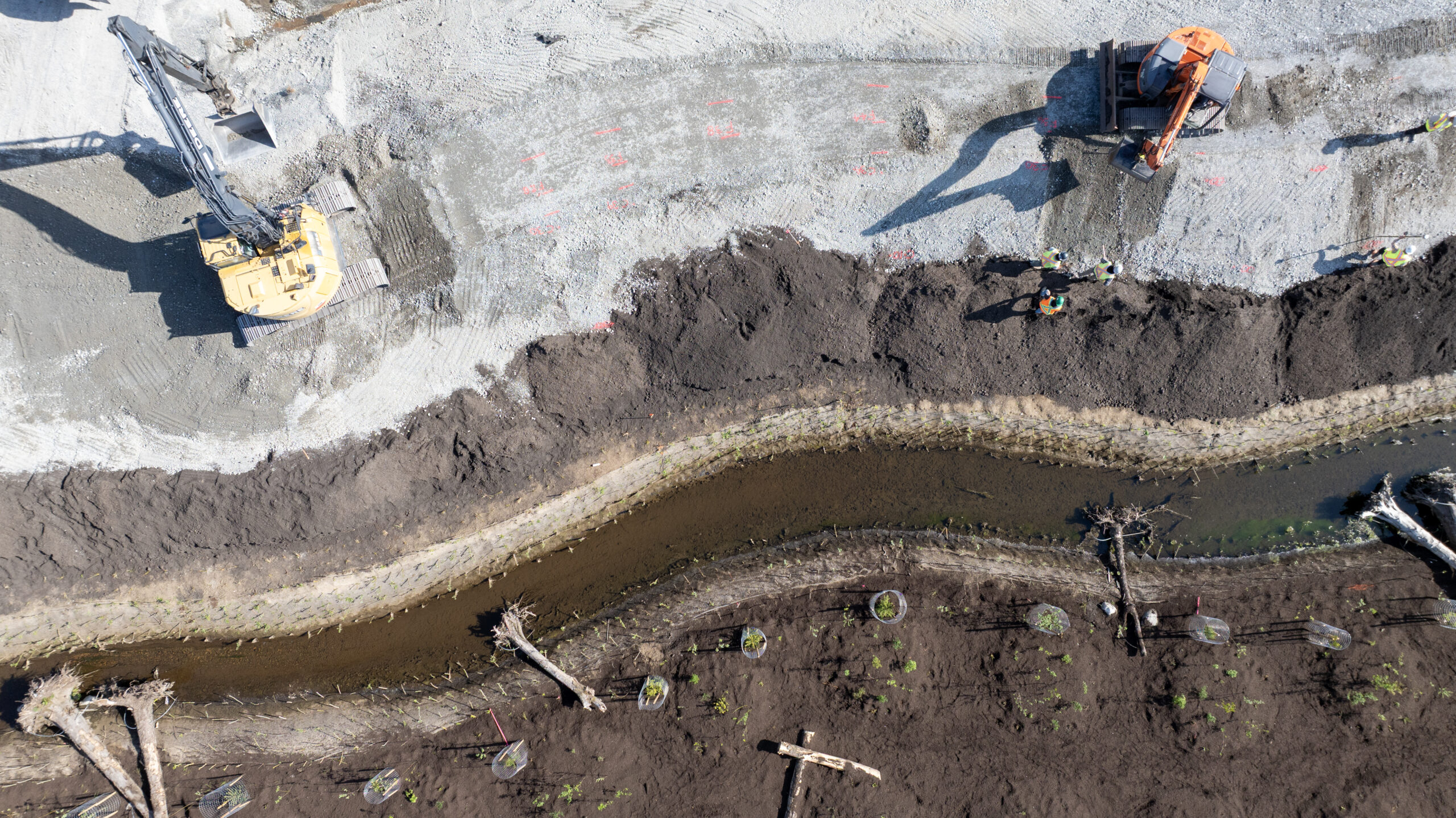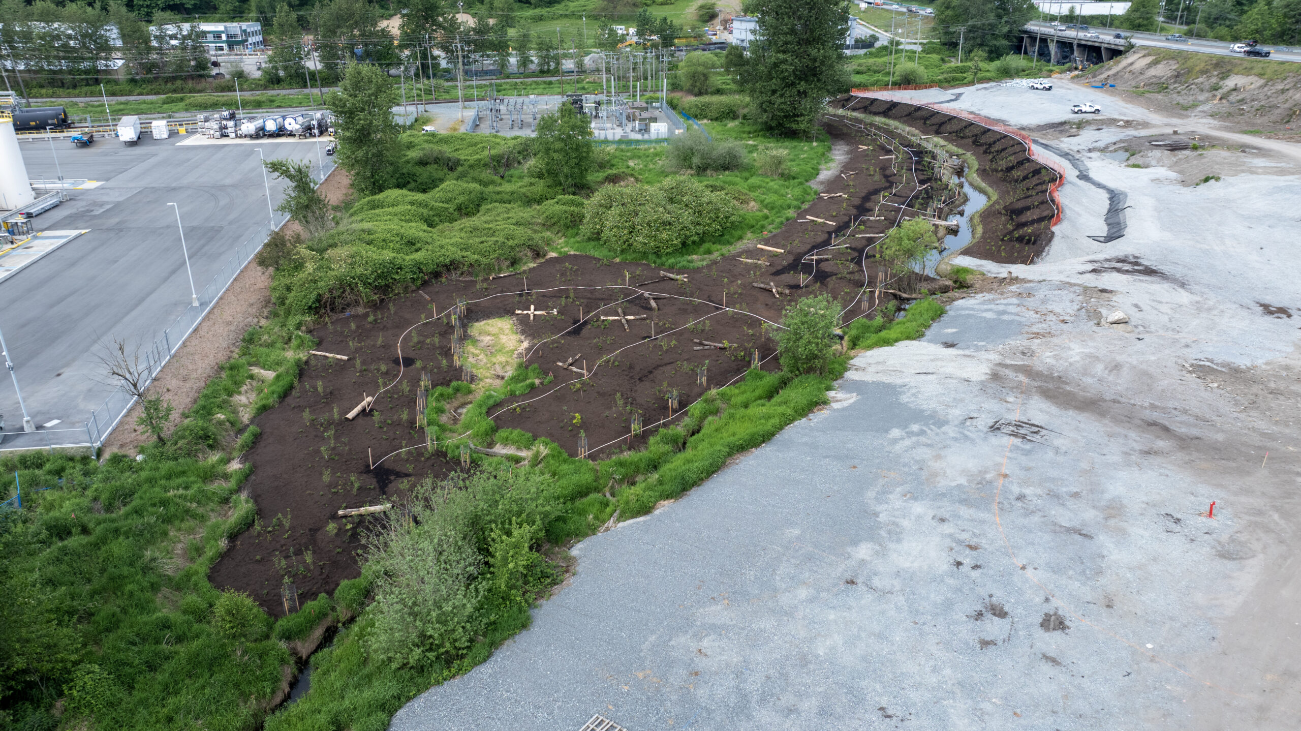 Milestone Environmental Contracting, in partnership with Sumas First Nation through the Wochmel Milestone Joint Venture, completed excavation, invasive species removal, soil management, and construction of a new creek channel. The works included channel stabilization, installation of liners and rock armouring, and riparian restoration to support long-term habitat function and channel performance.
