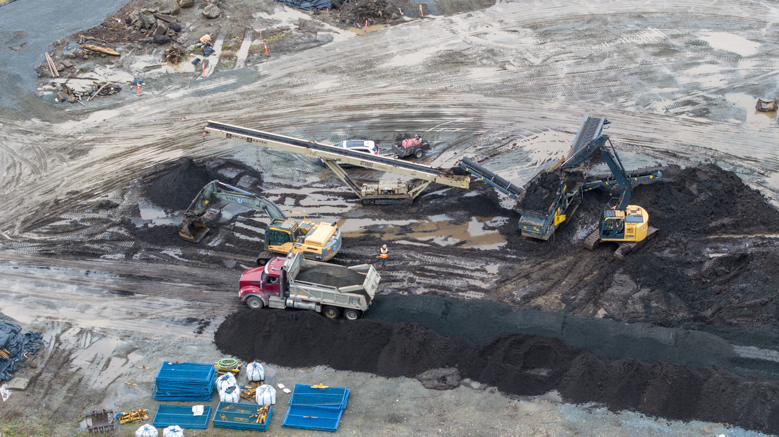 Saturated ground conditions following a significant atmospheric river event impacting excavation and material stability.