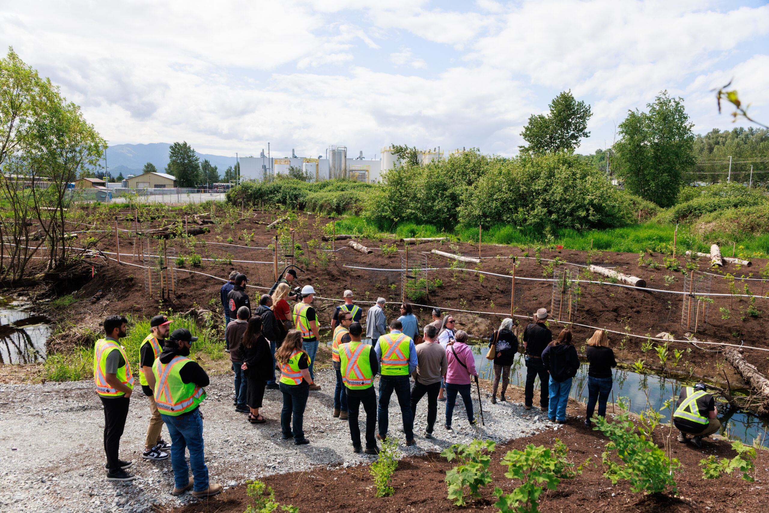 Throughout construction, Sumas First Nation contributed labour, materials, and on-site cultural monitoring to ensure the project aligned with Indigenous values and practices. They also played a key role in the ecological restoration of the site, recommending and supplying many of the plant species used for riparian rehabilitation to support culturally appropriate and environmentally suitable revegetation.